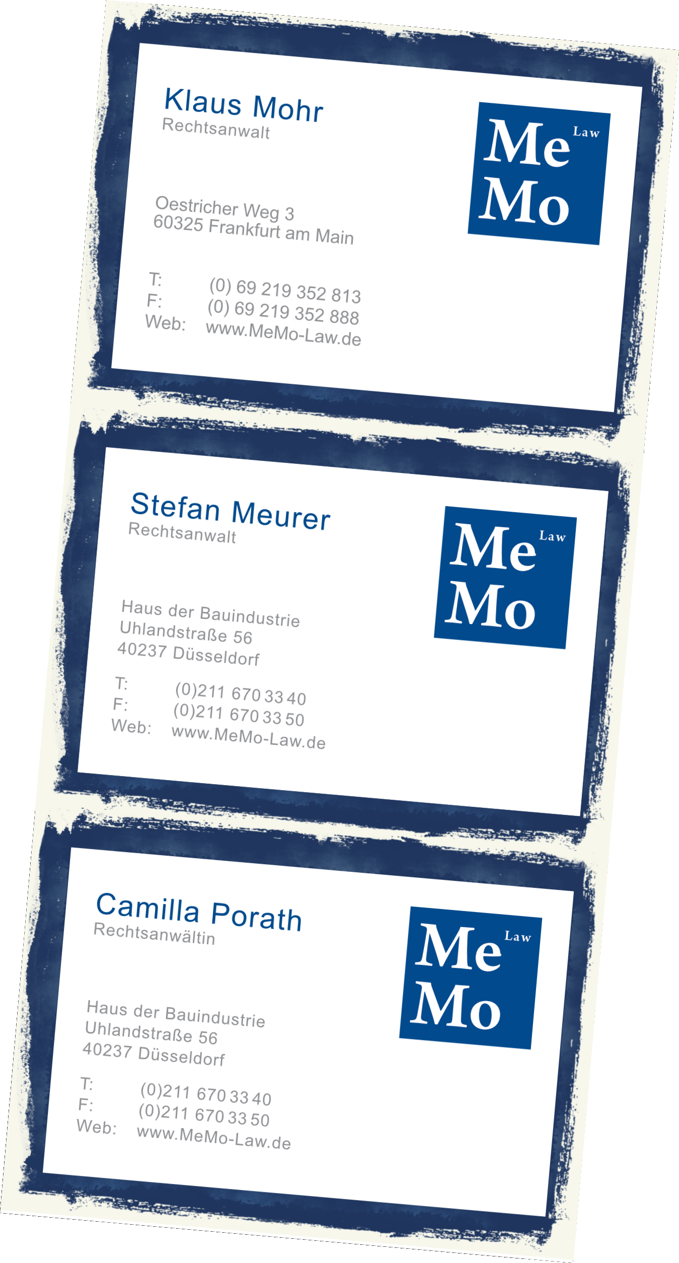 MeMo-Law ist eine auf wirtschaftsrechtliche Themen spezialisierte Kanzlei. Wir beraten deutsche und internationale Mandanten auf deutsch und englisch in ausgewählten Bereichen des Wirtschaftsrechts einschließlich Transaktionen (M&A, PE) und auf dem Gebiet des privaten Baurechts.